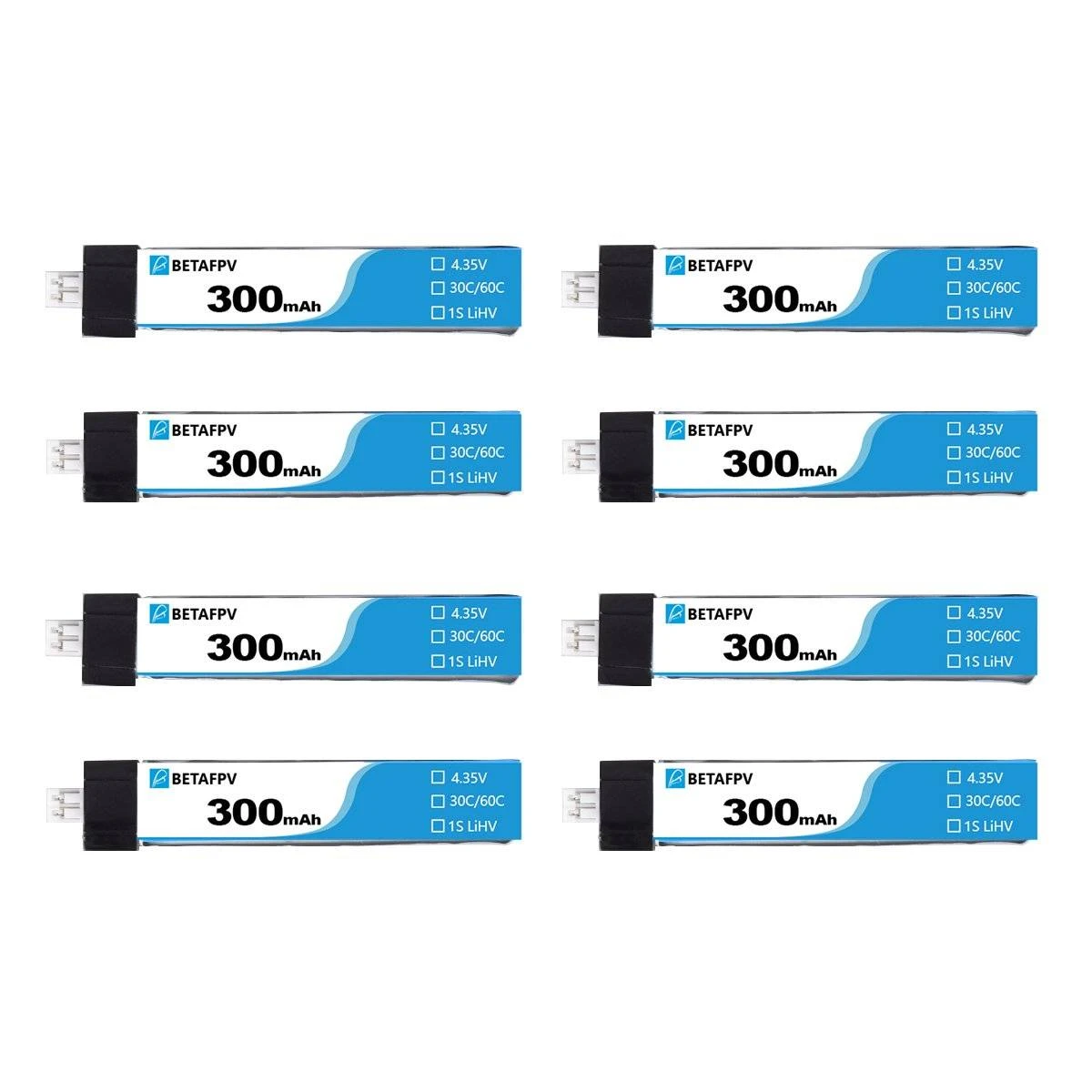 This box of eight 300mAh 1S HV batteries is a perfect way to stock up on those 1s lipos that you use up so quickly. BETAFPV upgraded their stock 1s batteries from 260mAh to 300mAh, increasing flight times to almost an extra minute. All while keeping the size almost identical, just a tiny bit longer.
