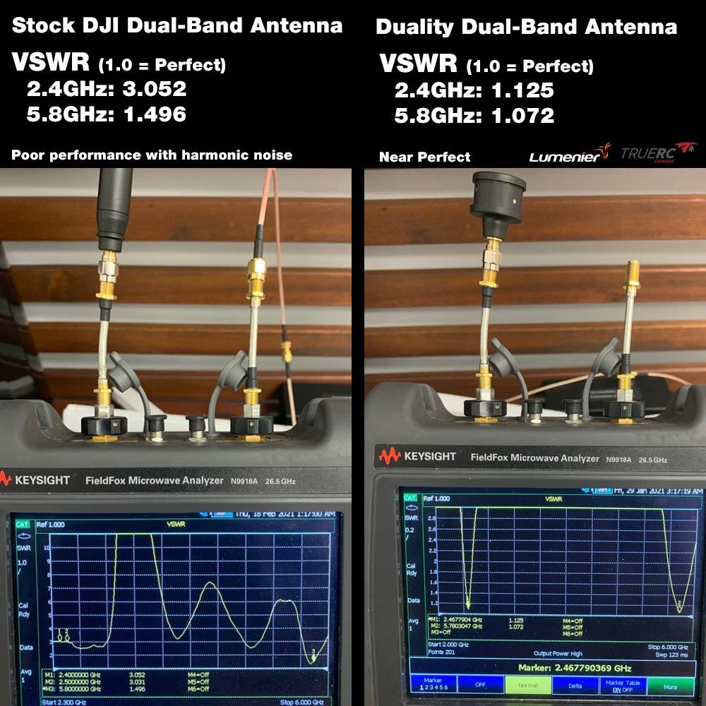 The Lumenier Duality Antenna was created in partnership with world-renown antenna designer TrueRC to bring you the first Dual-Band aftermarket antenna designed as a direct replacement and upgrade for your stock DJI antennas found on the DJI Digital HD FPV Goggles V2. The Duality antenna was made from the ground up to be a perfect match for the DJI goggles. Duality antennas are form fitting, low profile, color matching, direct connect RP-SMA, and all this with improved performance.