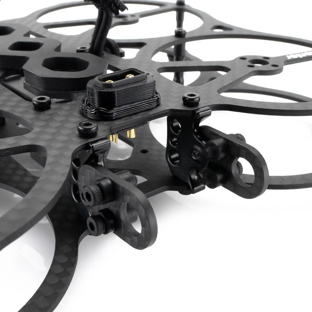 This unique vibration-dampening camera mounting system allows the pilot to use Gyroflow stabilization software. With a combination of aluminum brackets and durable carbon plates, this camera mounting system ensures better footage throughout your flight.