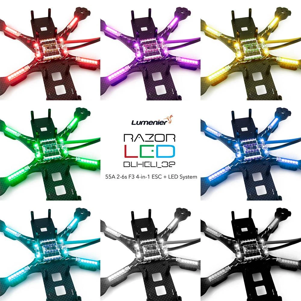 The Lumenier Razor LED 55A 4in1 F3 BLHeli_32 2-6s ESC is a 32bit ESC running the latest gen. BLHeli_32 firmware, and featuring future proof powerful F3 processors. Now 4 of these ESCs combine to have more processing power than your whole flight controller! The 32bit architecture enables the ESC to run at incredible speeds resulting in better performance, faster input signals and lower latency compared to older 8bit ESCs. This ESC also features a live telemetry connection for more advanced flight controllers, as well as a top of the line current sensor.