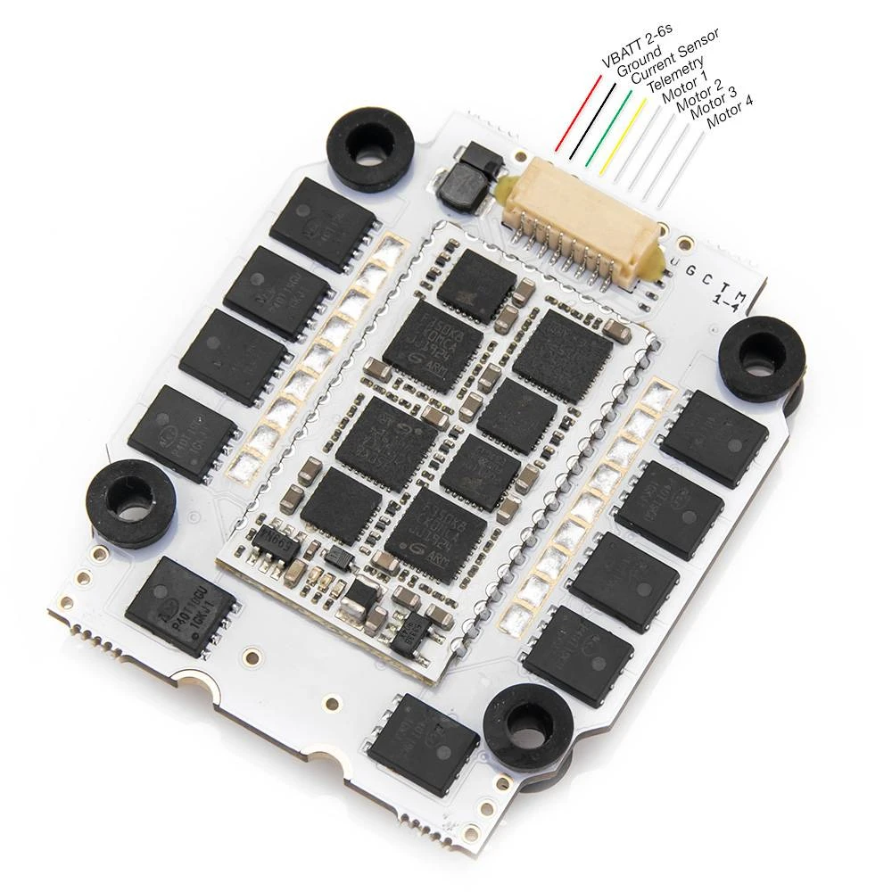 - 8pin connector pinout: VBAT, Ground, Current ADC, TLM, Motor 1, Motor 2, Motor 3, Motor 4